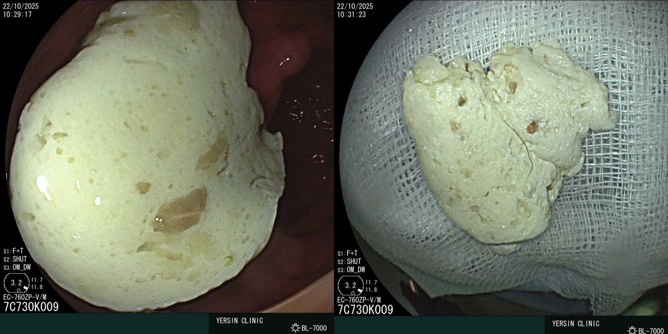 Sau khi tiến hành gắp dị vật qua nội soi, mọi người kinh ngạc khi dị vật được lấy ra là một khối kẹo cao su cuộn tròn, kích thước ước tính khoảng 5 cm. Ngay sau khi dị vật được loại bỏ, bệnh nhân T. cho biết các triệu chứng chướng bụng và đau bụng đã giảm đi một cách rõ rệt.