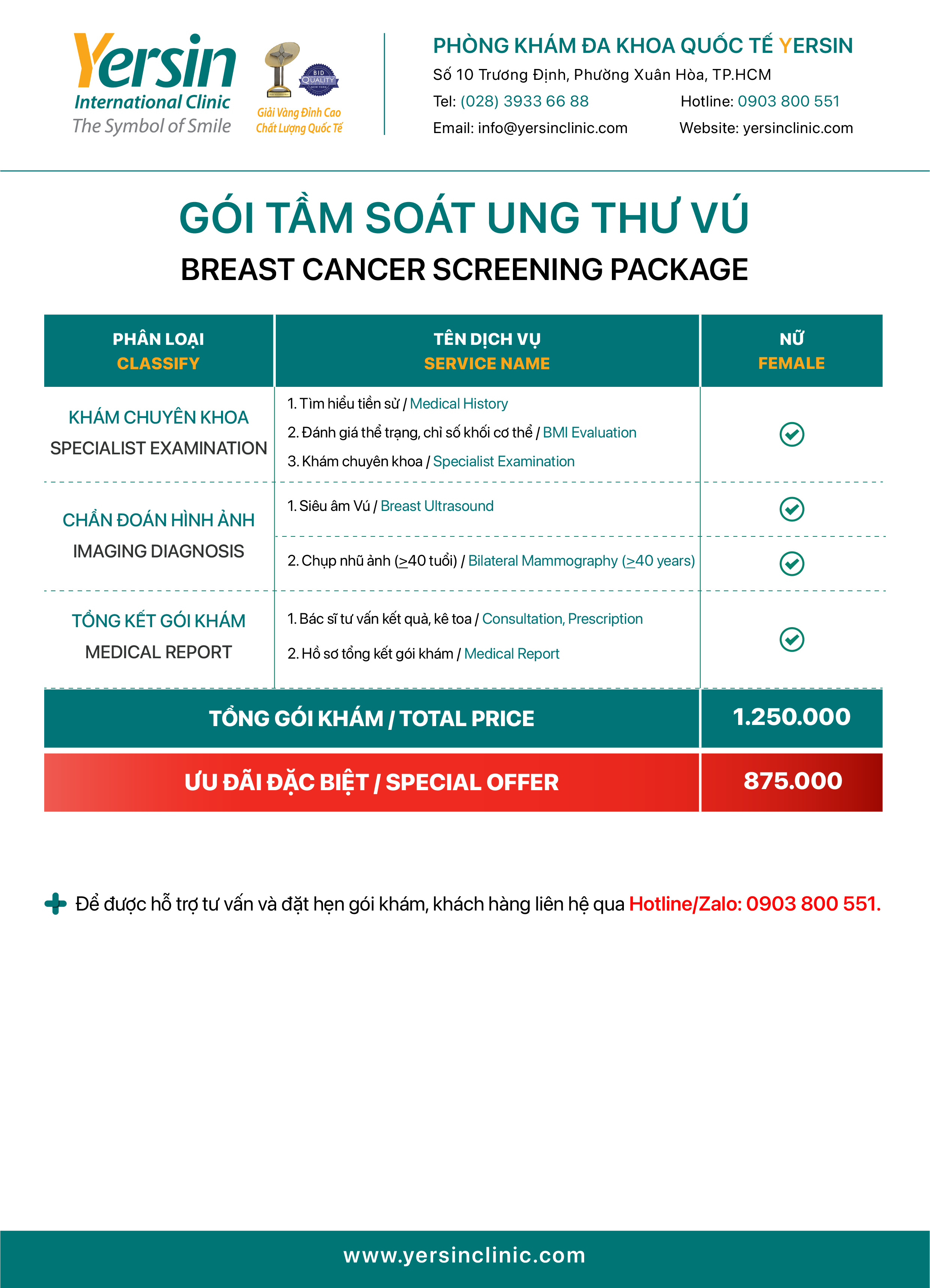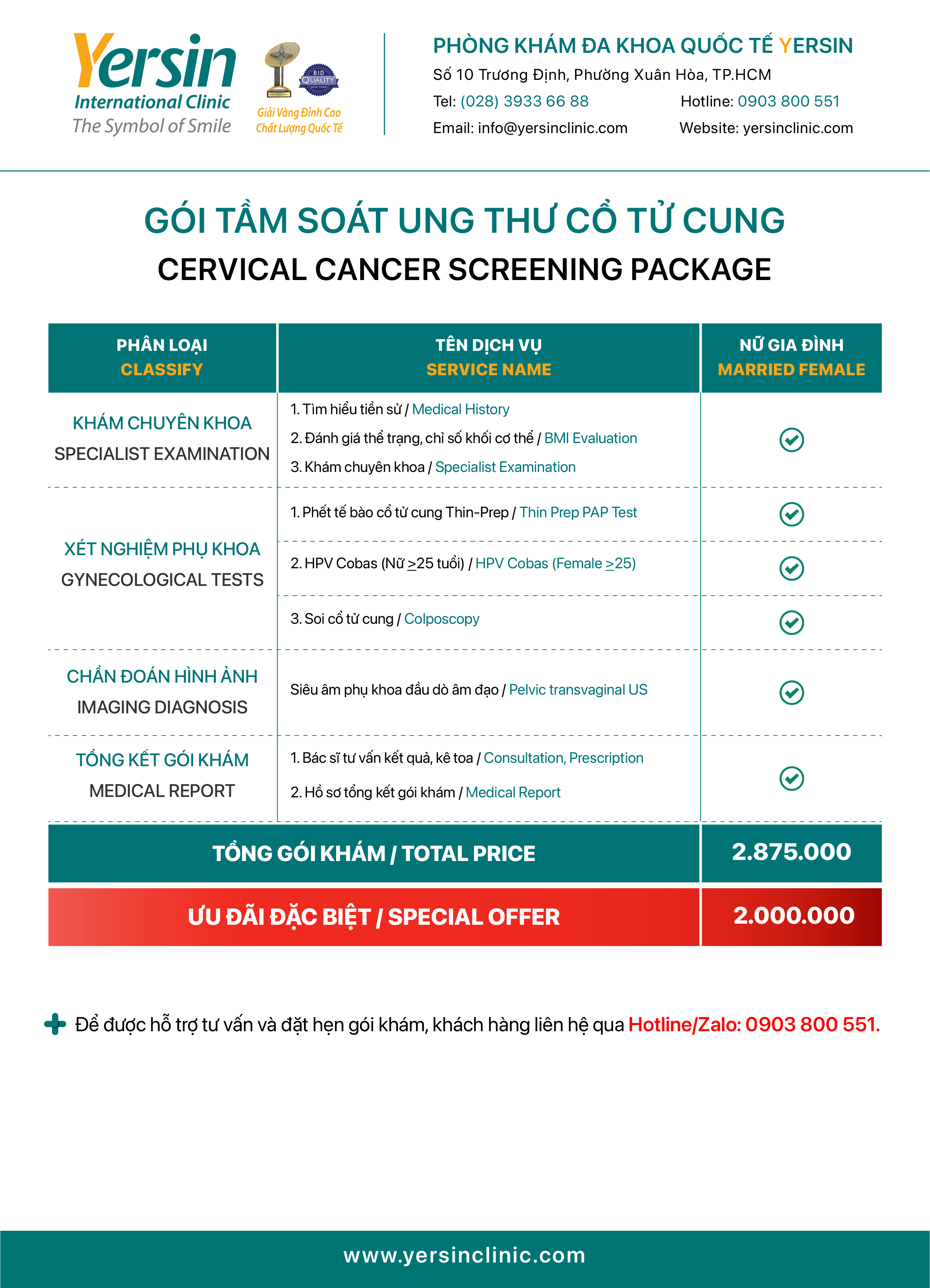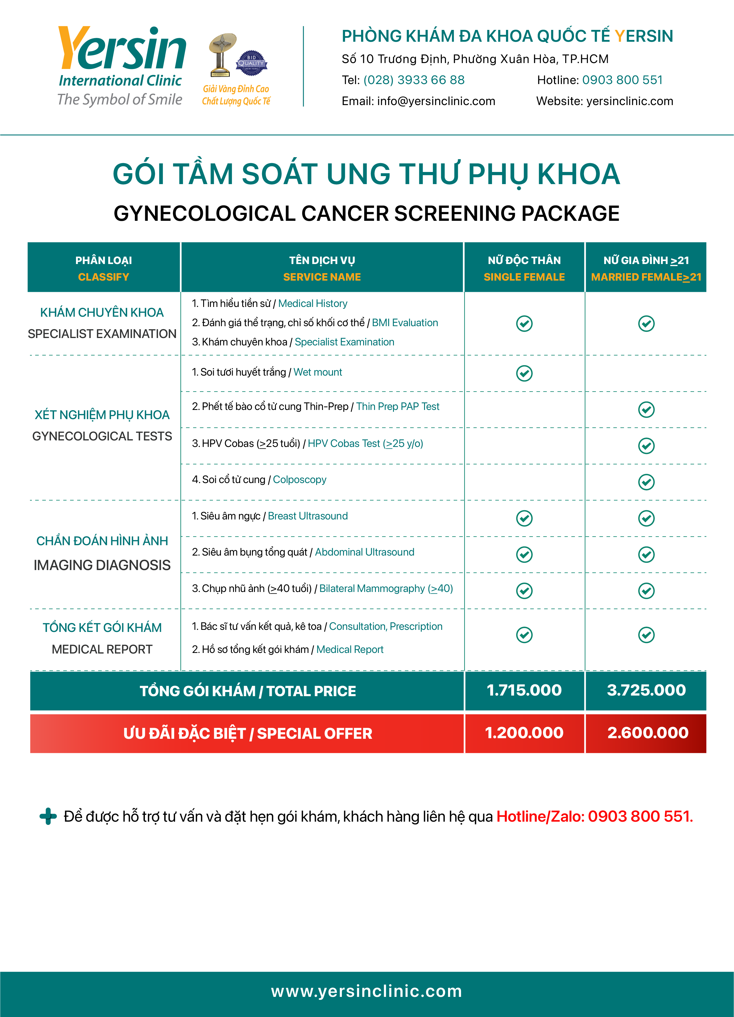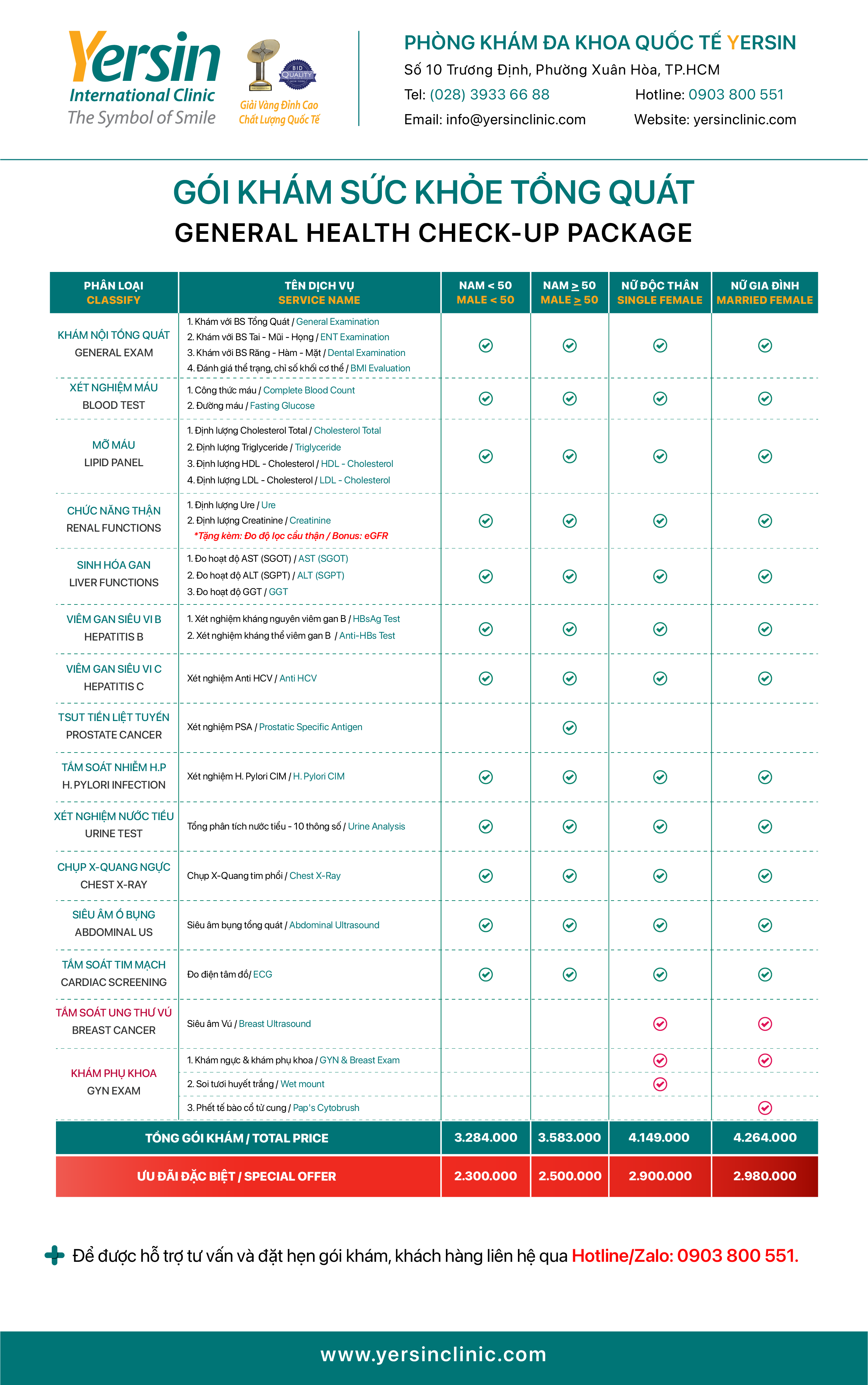 For detailed consultation on checkup packages, promotions, and to quickly book an appointment at Yersin Clinic, please: